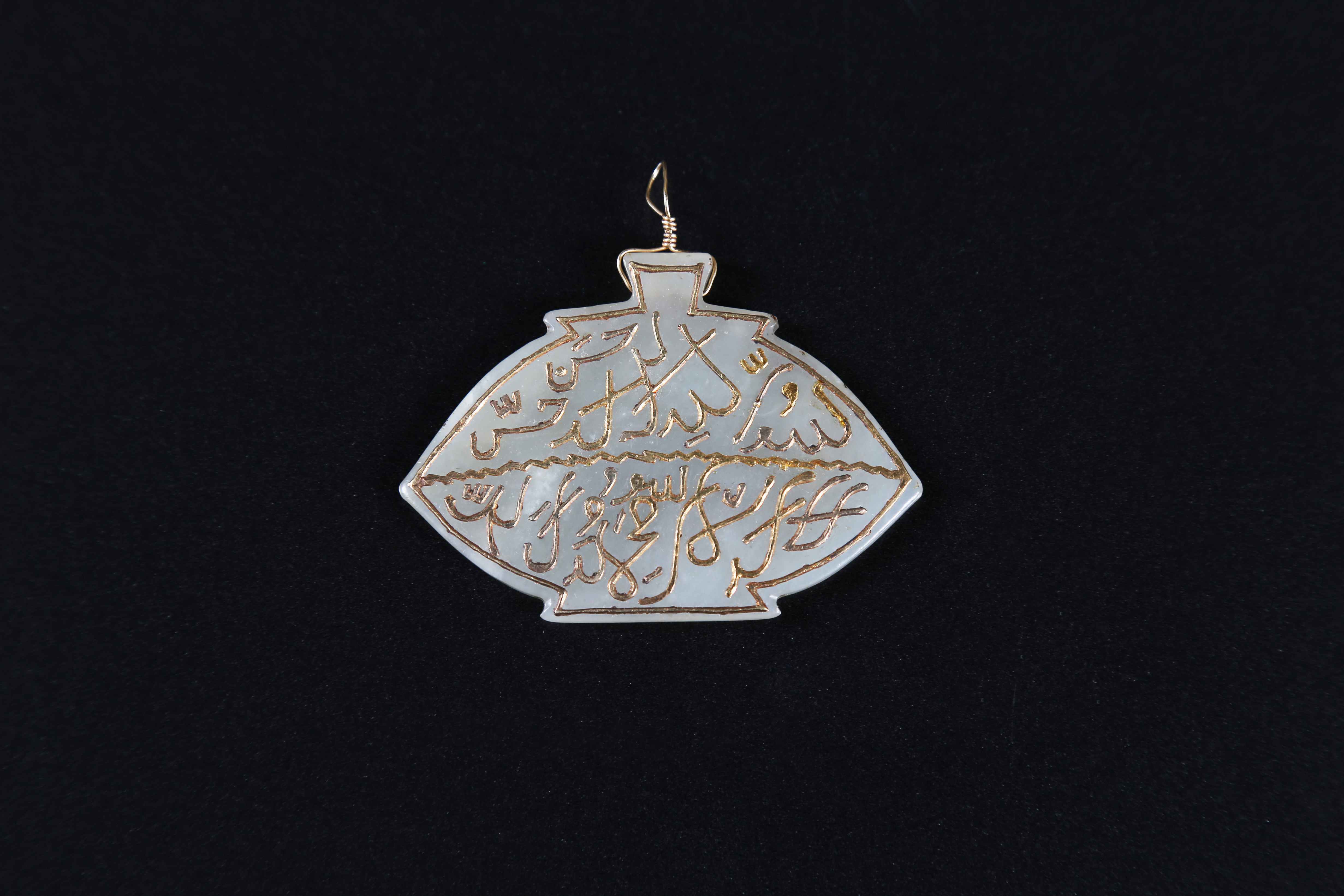 India, 19th century. . Cm 6,50 x 4,00. This jade pendant is decorated with talismanic golden inscriptions made with kundan technique. The inscriptions praise Allah and the Prophet ("There's no god but Allah and Muhammad is His messenger").