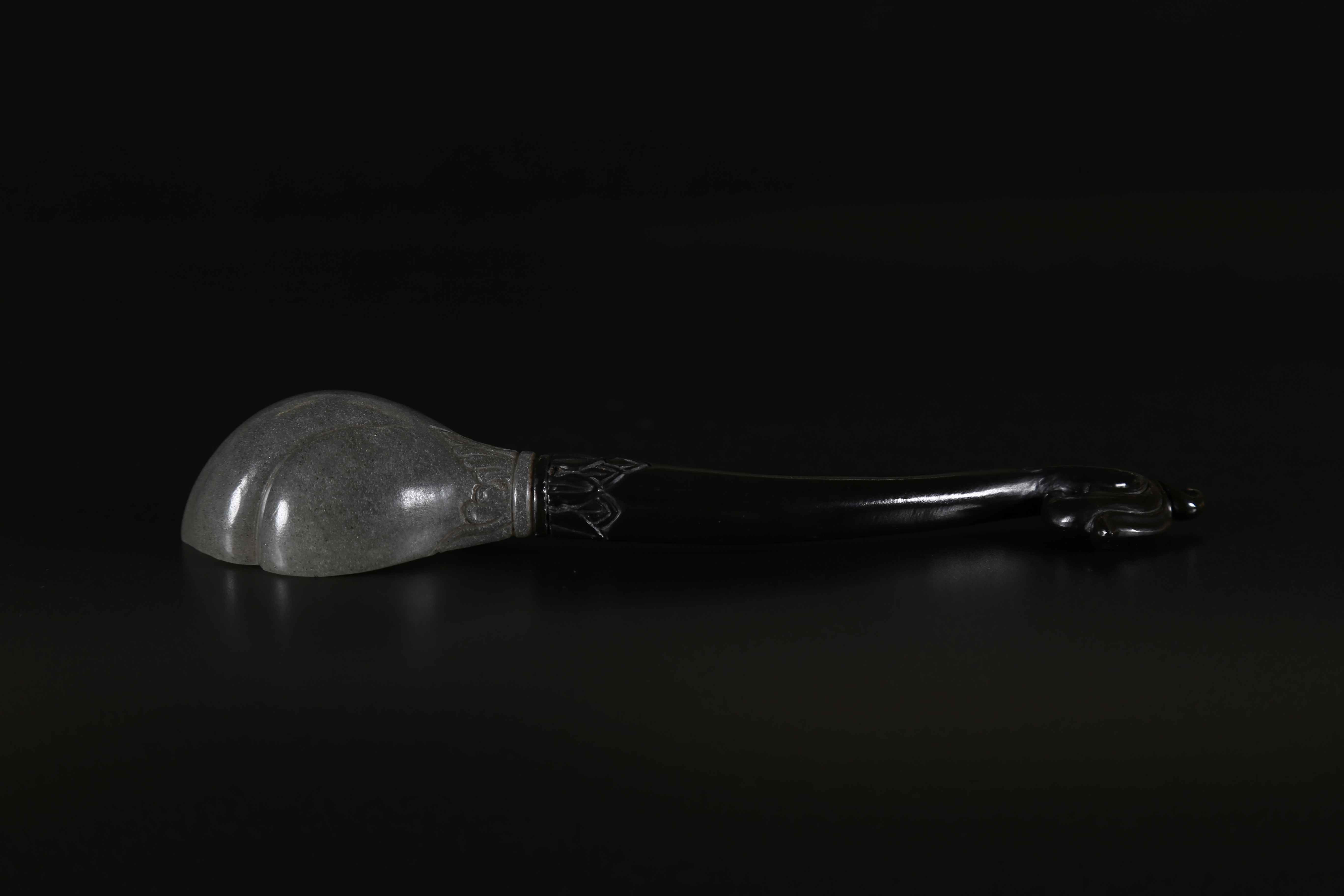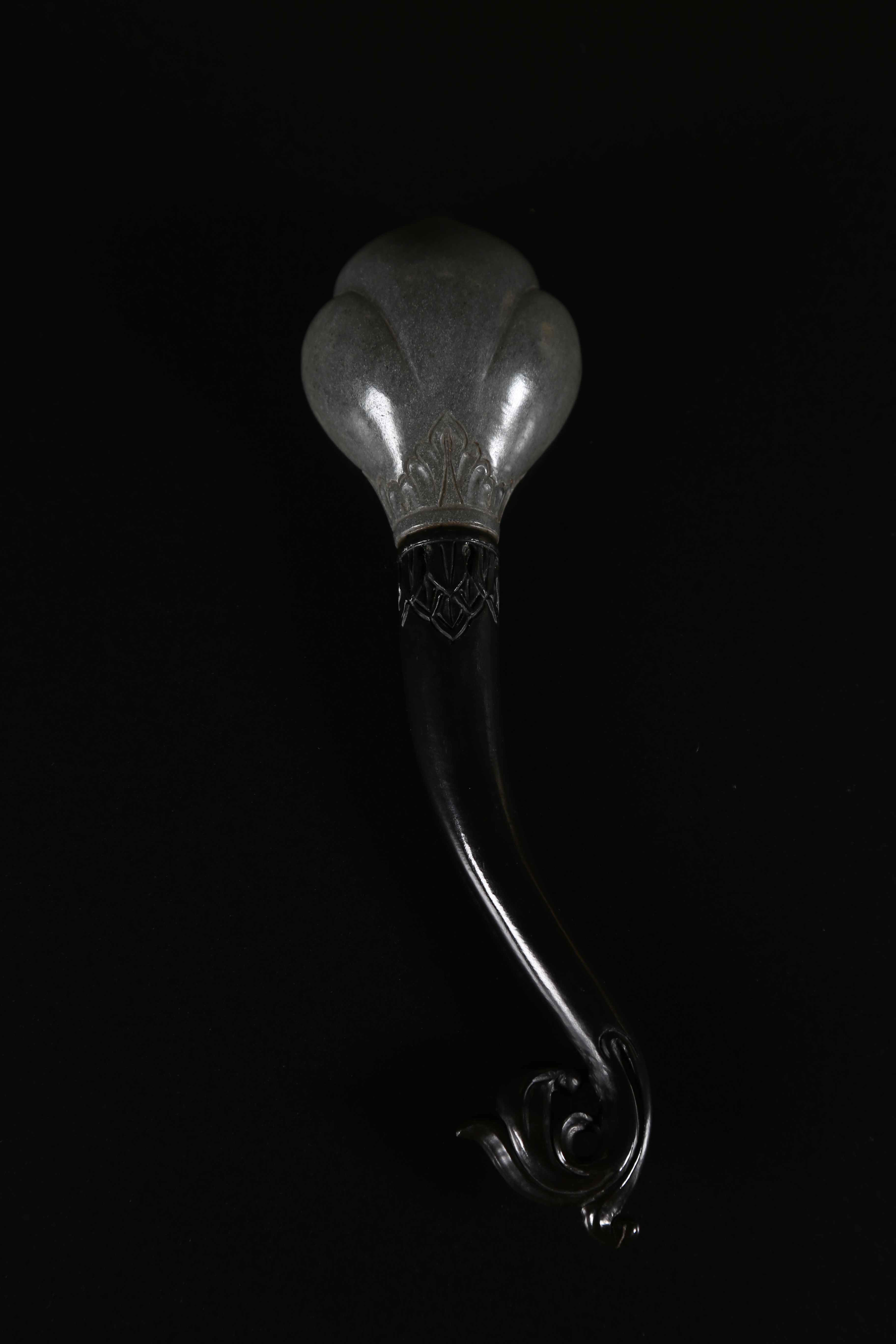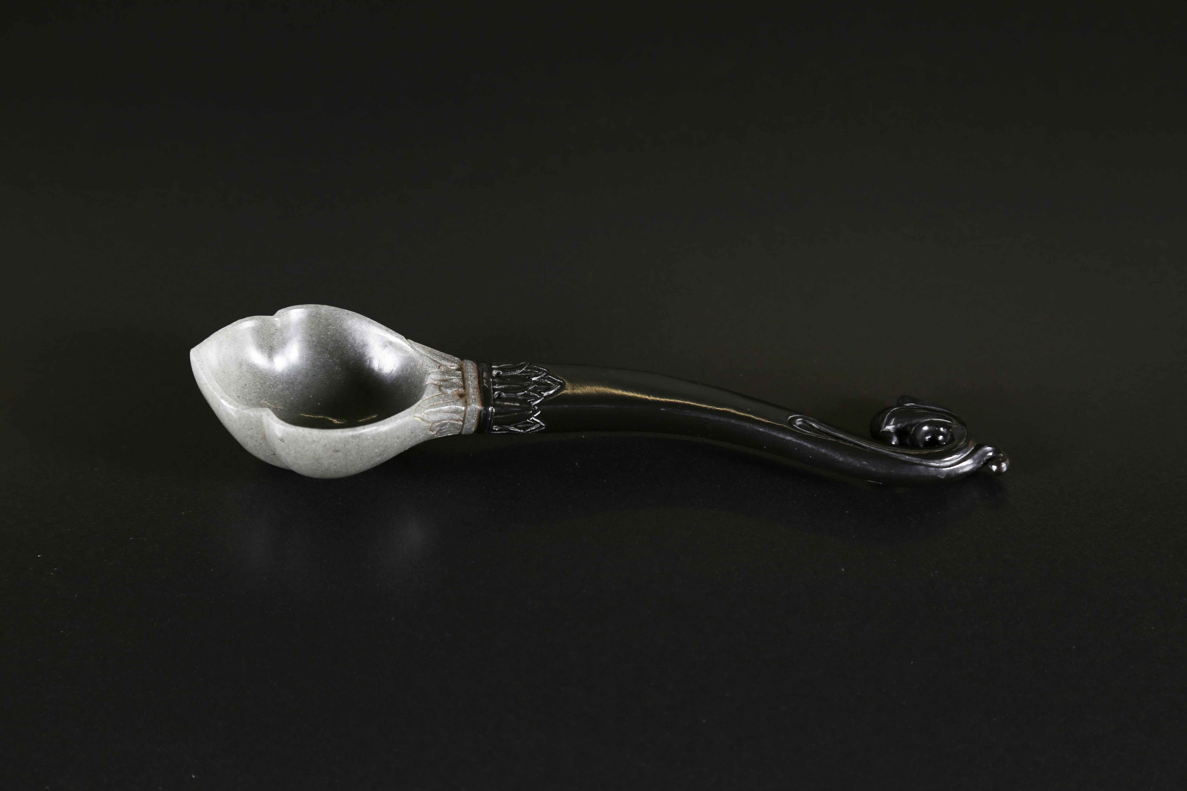 India, XIX secolo. -. Cm 20,00. Bel cucchiaio lobato in giada grigia. il manico ha una delle estremità intagliata a foglia, l'altra, quella che lo congiunge al cucchiaio, è intagliata con motivi vegetali sul fronte e sul retro.