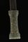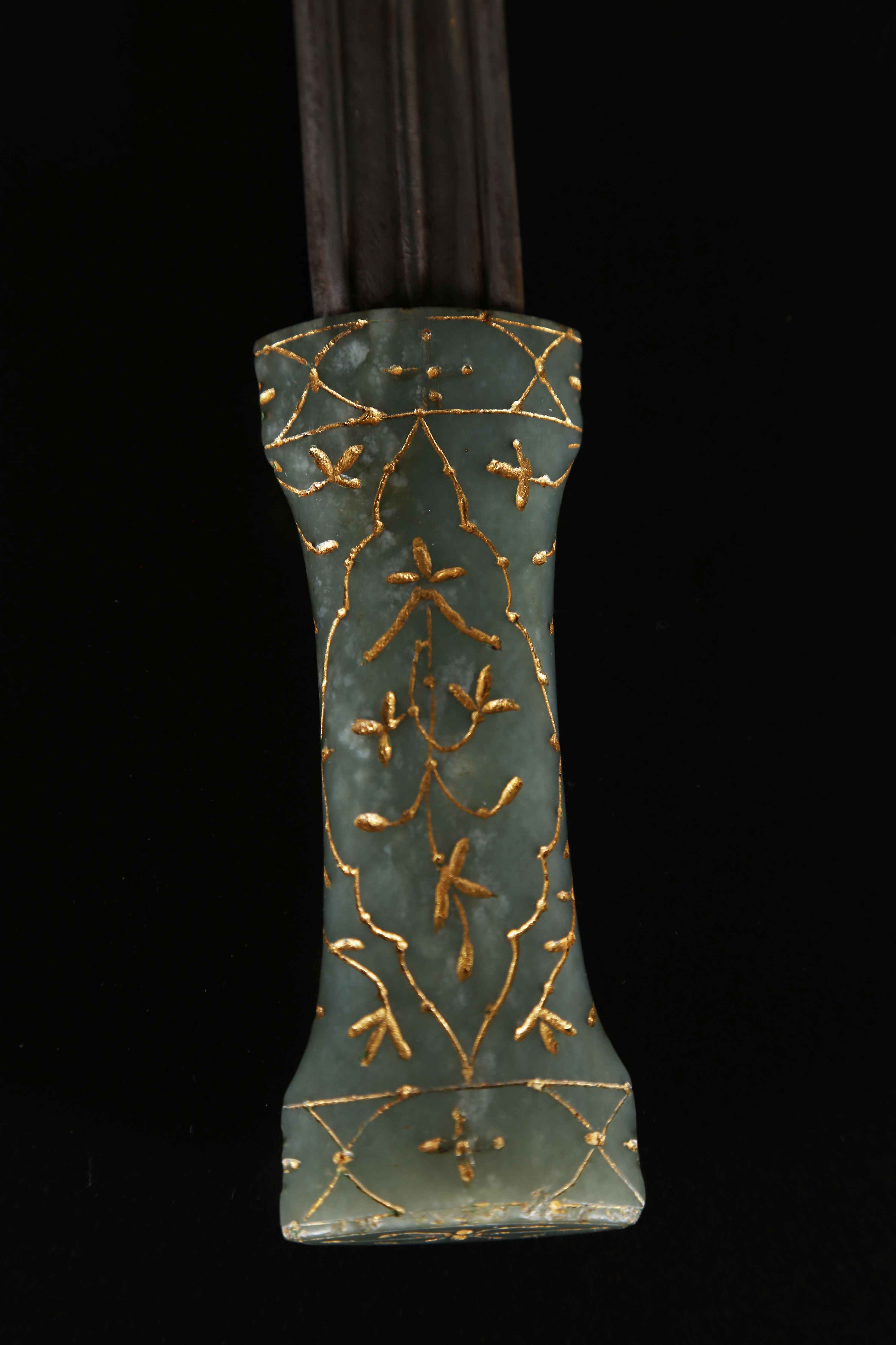 India, XVIII secolo. . Cm 45,00. Lama in acciaio damasco a due fili con nervatura centrale, l'elsa in giada a forma di clessidra finemente cesellata e dorata con due sottili fasce orizzontali alle estremità e due cartucce lobate contenenti un delicato motivo floreale sulle due facce dell'impugnatura. Fodero in velluto rosso porpora.
