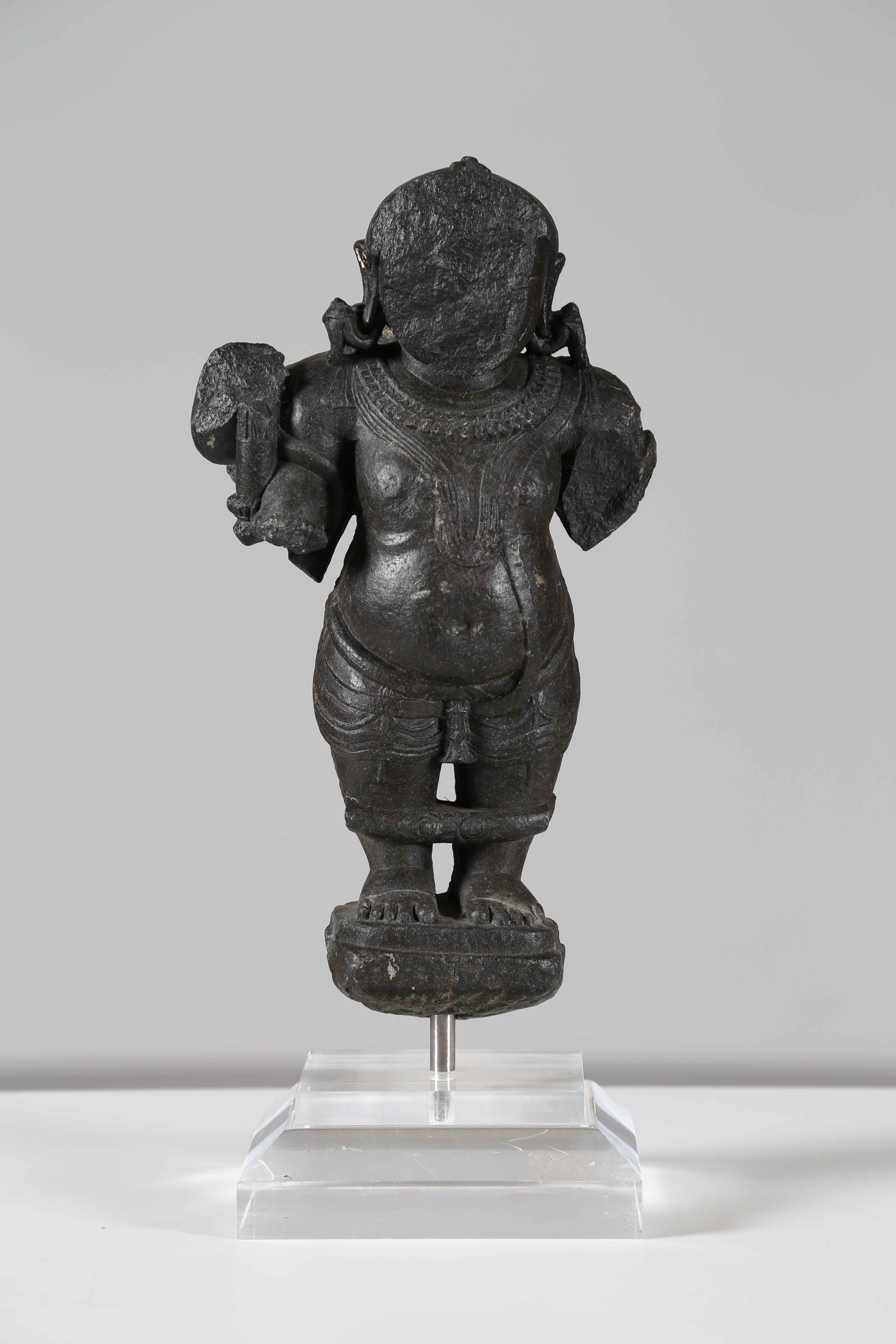 India meridionale, periodo Chola, XIII secolo. -. Cm 32,00. Raffinata scultura in pietra nera lavica raffigurante il brahmino nano o fanciullo Vamana, ovvero il quinto avatara, ed il primo in forma umana, del dio Vishnu, qui ritratto nella sua variante a quattro braccia.