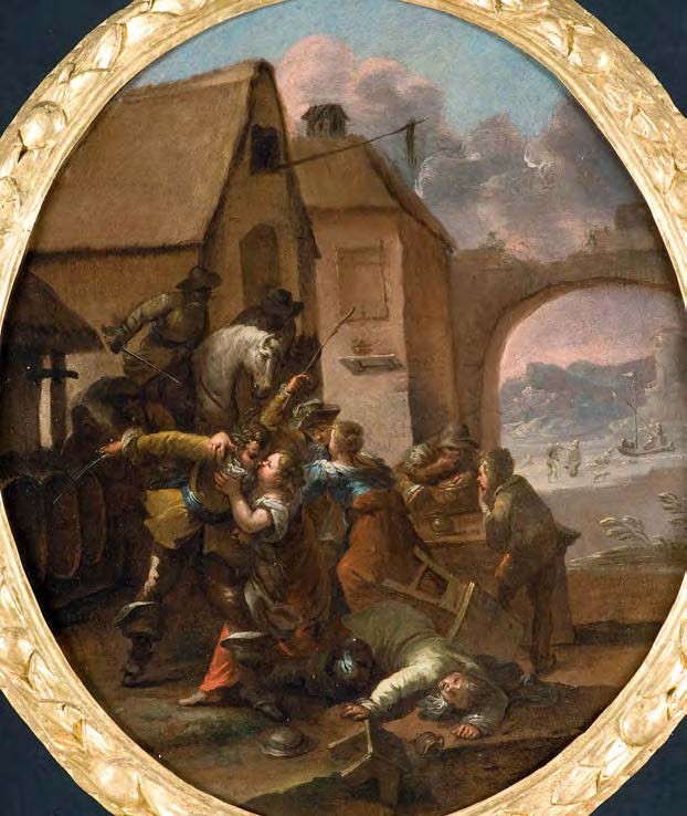 Francesco Simonini Parma 1686 – 1766 A) BATTAGLIA TRA TURCHI E CRISTIANI B) SCENA D’OSTERIA olio su tela ovale, cm 70x83,5 ciascuno.