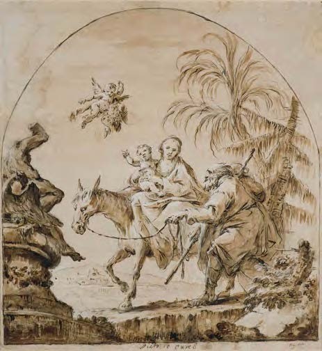 Iacopo Marieschi Venezia 1711 – 1794 FUGA IN EGITTO penna, pennello inchiostro nero, acquerello bruno, tocchi di biacca, matura su carta preparata avana, mm 443x412. Iscritto in basso a destra: Marieschi Provenienza: Milano, Finarte, Asta n. 572, Una collezione di disegni antichi, 4 dicembre 1986, lotto n. 193; Collezione privata. Bibliografia: A. Bettagno, Le Dessin Vénitien au XVIII siècle, catalogo della mostra presso la Galleria Heim, Parigi 1971, n. 163, p. 78, fig. 163.