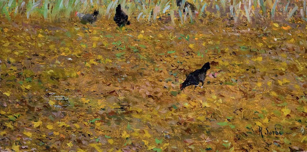 Raffaello Sorbi Firenze 1844 – 1931 NEL PRATO olio su tavola, cm 9,5x18. Firmato in basso a destra: R. Sorbi