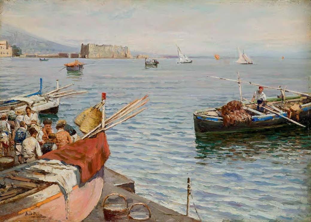 Attilio Pratella Lugo 1856 – Napoli 1949 PESCATORI A MERGELLINA olio su tavola, cm 25x35. Firmato in basso a sinistra: A. Pratella Provenienza: Napoli, Galleria Giosi (timbro a secco al retro); Collezione privata.