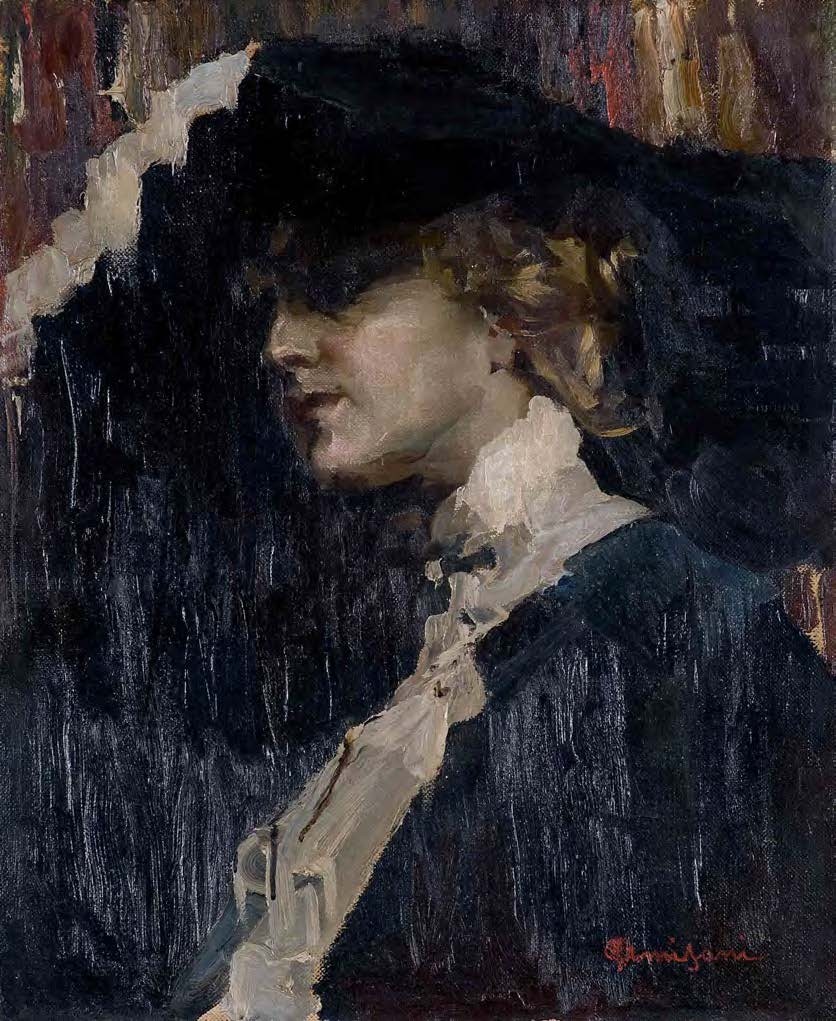 Giuseppe Amisani Mede Lomellina 1881 – Portofi no 1941 RITRATTO DI DONNA CON CAPPELLO olio su tela, cm 50x60. Firmato in basso a destra: Amisani