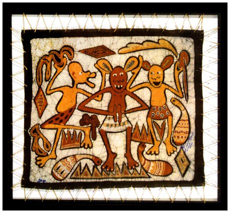 GEORGE LILANGA 1934 – 2005 Tunaomba kwa tupate vuha 1980 Pittura su batik 99 x 107. Firma in b. a s.; titolo in b. a d. Autentica dell’autore su foto. Pubbl.: “George Lilanga. Catalogo raisonnè Vol.II” Fabbrica Sarenco, Brescia, 2005, p.5.