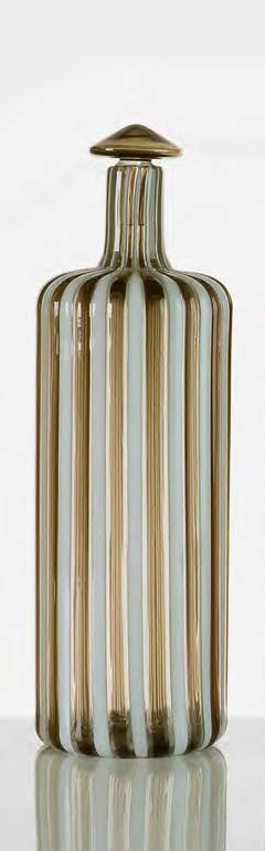 PAOLO VENINI Bottiglia in vetro con tappo a canne, colore lattimo e talpa....