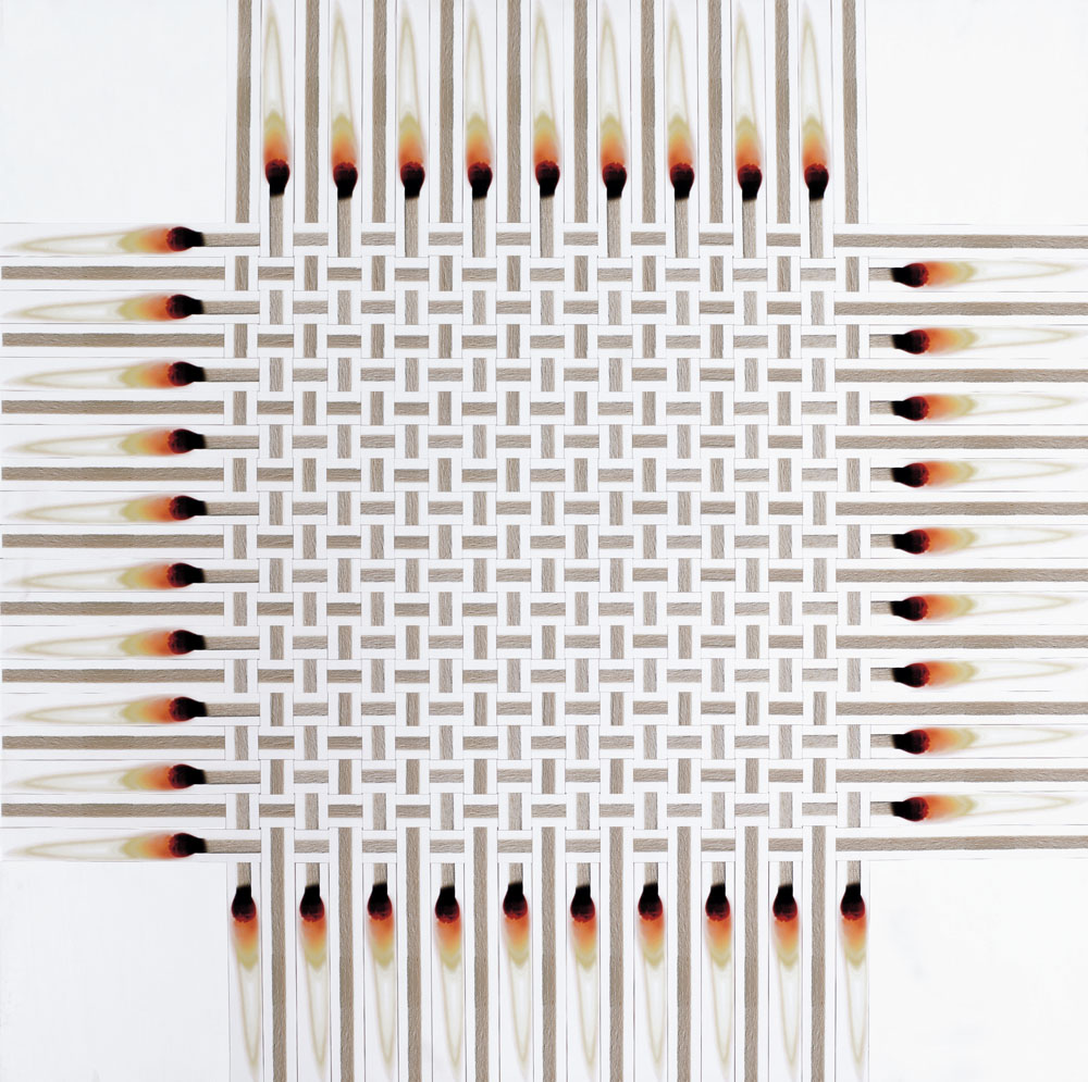 MIMMO IACOPINO Milano 1962  Fuochi geometrici, 2005 tecnica mista su carta fotografica, tela e legno cm. 100x100, firma, titolo e anno al retro, pubblicato sul catalogo Mimmo Iacopino mostra tenutasi dal 15/09 al 15/10/2005 presso la Galleria Cà di Frà (MI) in copertina e a pagina 17, opera senza cornice.