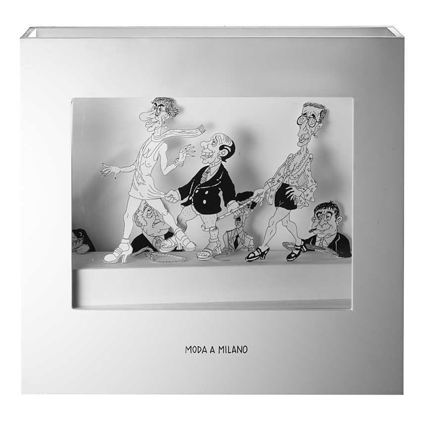 "Moda a Milano" personaggi vari, teatrino in carta contenuto in teca di legno e vetro, 1994 (cm 45x42x12)