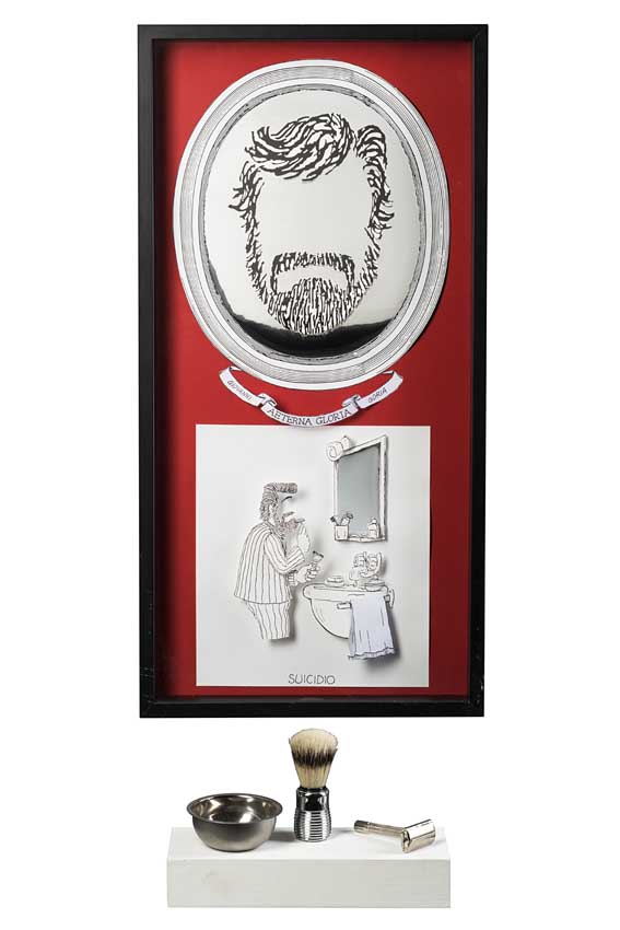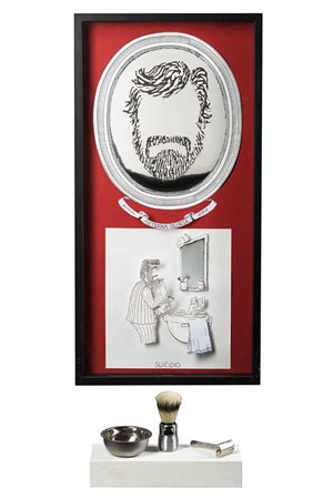 Reliquiario "Giovanni Goria" cartoncino in 3D a colori contenuto in teca (cm 70x35) con una base in legno con rasoio e pennello da barba in metallo