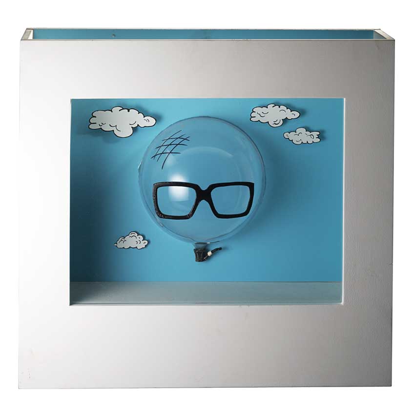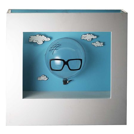 "Bettino Craxi Magritte" teatrino in carta contenuto in teca di legno e vetro, 1979 (cm 45x42x12)