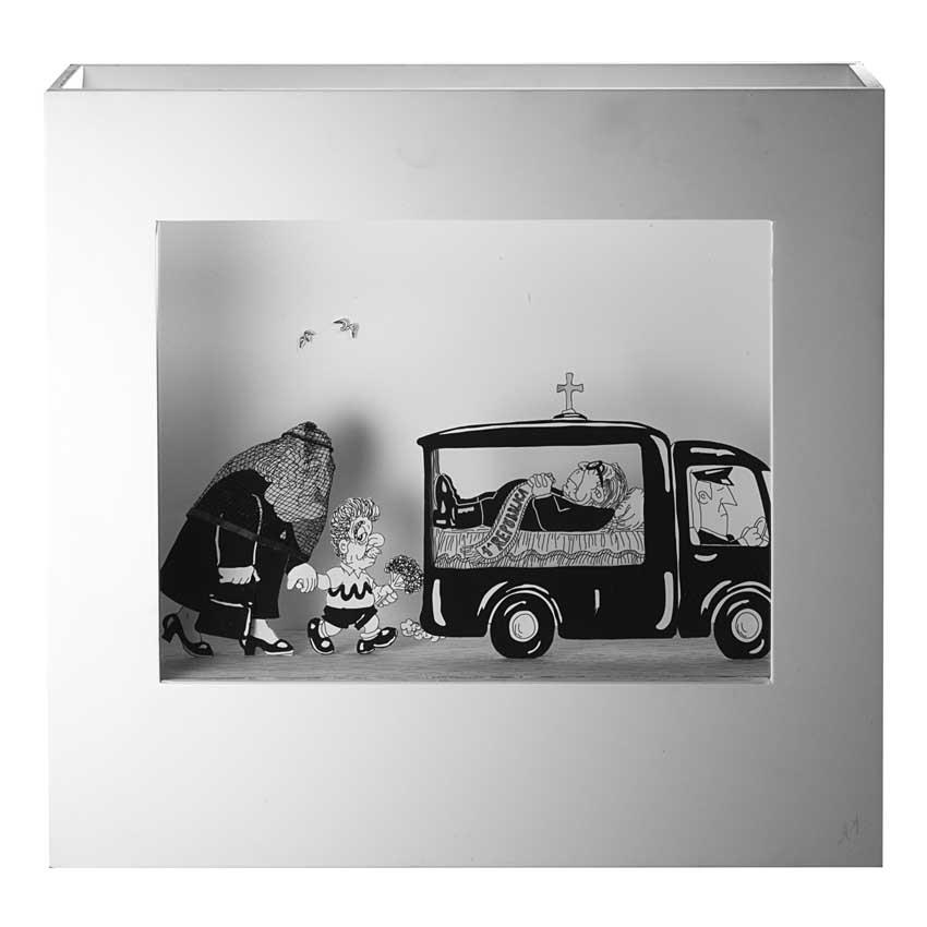 "La fine della prima Repubblica" personaggi vari, teatrino in carta contenuto in teca di legno e vetro, 1994 (cm 45x42x12)
