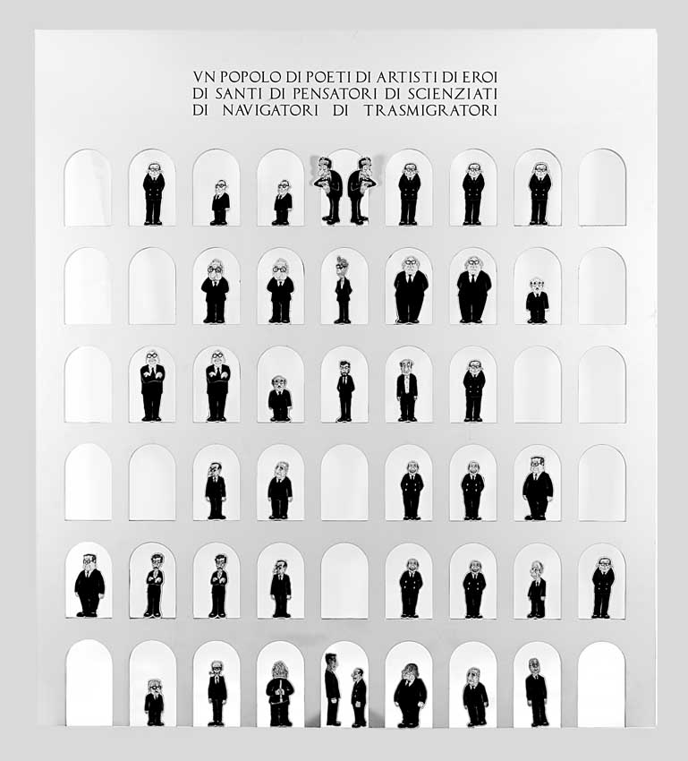 "Colosseo quadrato" installazione composta da sagome entro cornice...