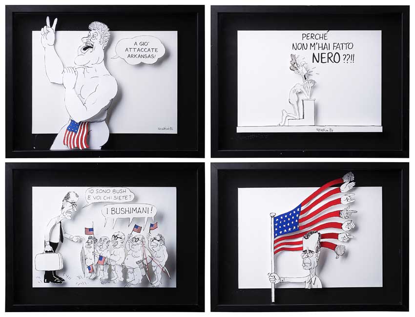 "Il reverendo Jesse Jackson in Siria" 1984; "L'elezione di George Bush" 1988; "Bush a Roma" 1989; "L'elezione di Bill Clinton" 1992. Gruppo di quattro cartoncini in 3D contenuti in teca (cm 30x40)