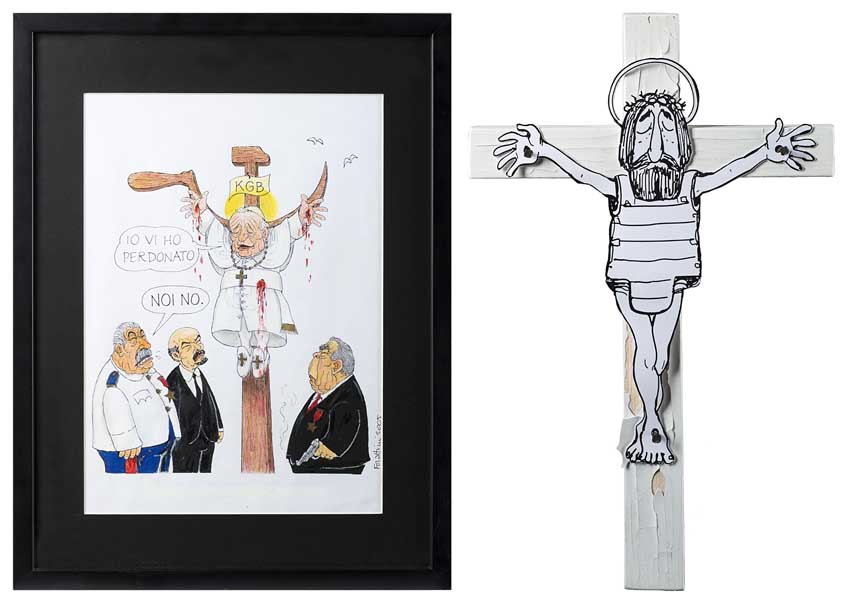 Originali "Si parla dell'attentato al Papa: Stalin, Lenin e Tito" 1990 litografia con intervento a mano dell'artista a colori (cm 30x20) ed un crocefisso con Gesù in giubbotto antiproiettile in legno e carta