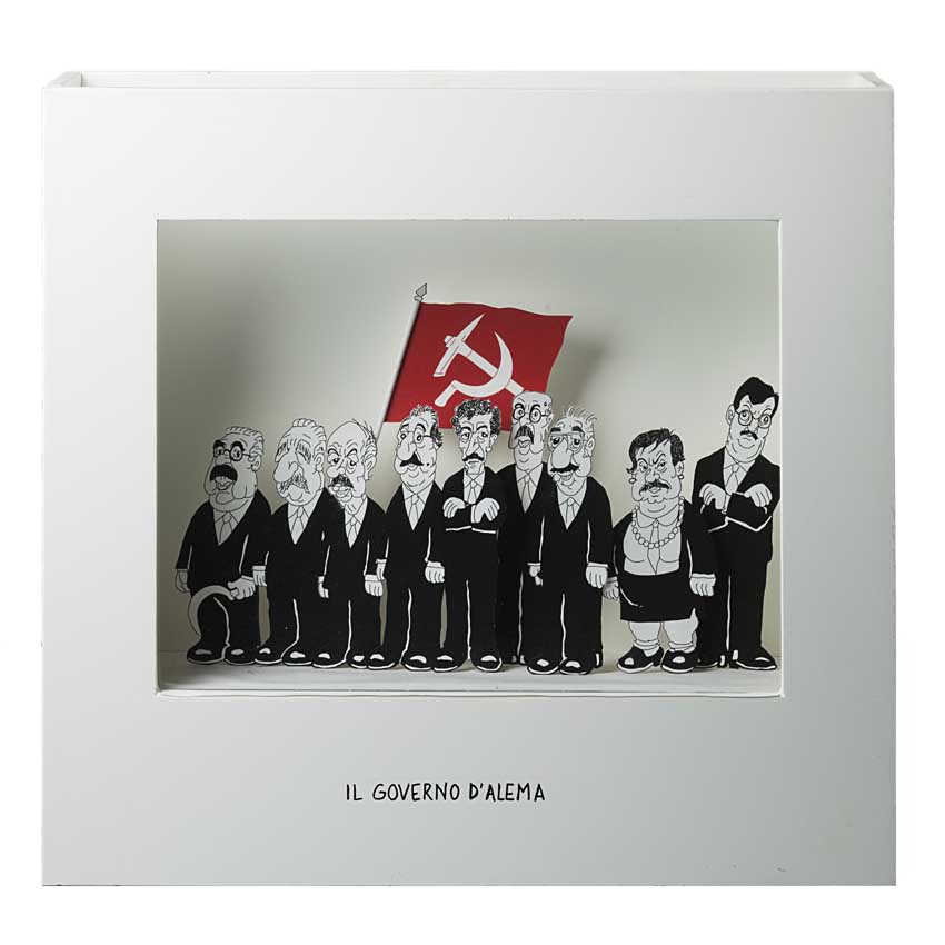 "Il governo D'Alema" personaggi vari, teatrino in carta contenuto in teca di legno e vetro, 1999 (cm 45x42x12)