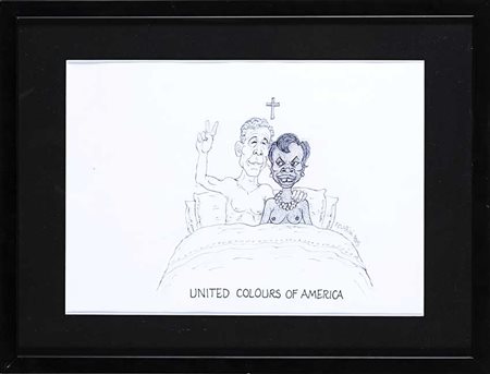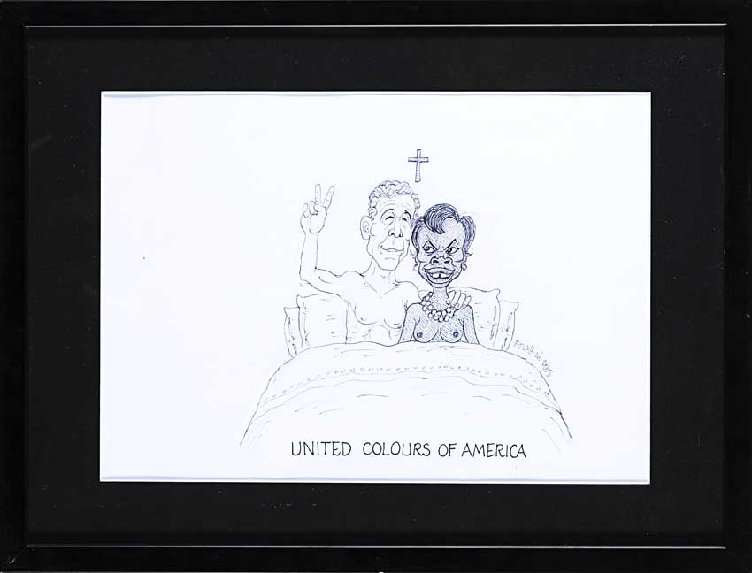 Originali "George W.Bush e Condoleeza Rice" disegno a pennarello e bianchetto in bianco e nero, 2005. In cornice (cm 20x30)