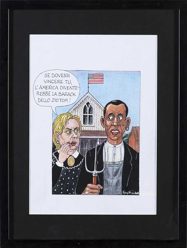 Originali "Barack Obama e Hillary Clinton: American Gothic" tecnica mista a colori su base litografica. In cornice (cm 30x20)
