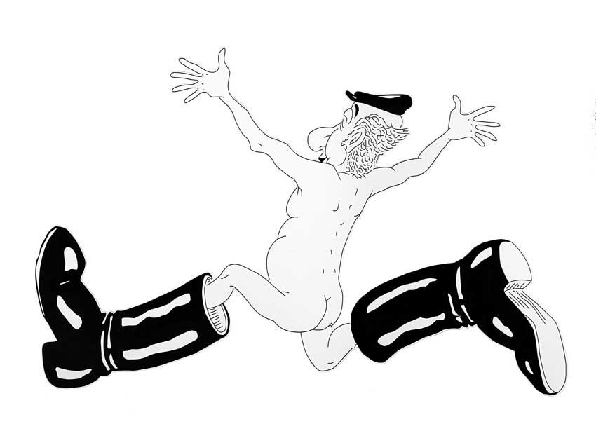 "Ciriaco De Mita nudo con stivaloni Mussolini" sagoma in bianco e nero (cm 140x180)