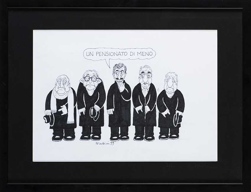 Originali "Un pensionato di meno" personaggi vari 1999, originale pennarello su carta in bianco e nero. In cornice (cm 30x20)
