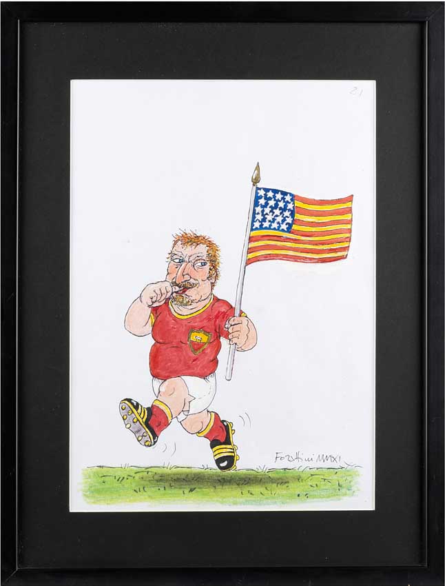 Originale "Francesco Totti e l'acquisto della Roma" 2010 litografia con intervento a mano dell'artista a colori (cm 30x20)