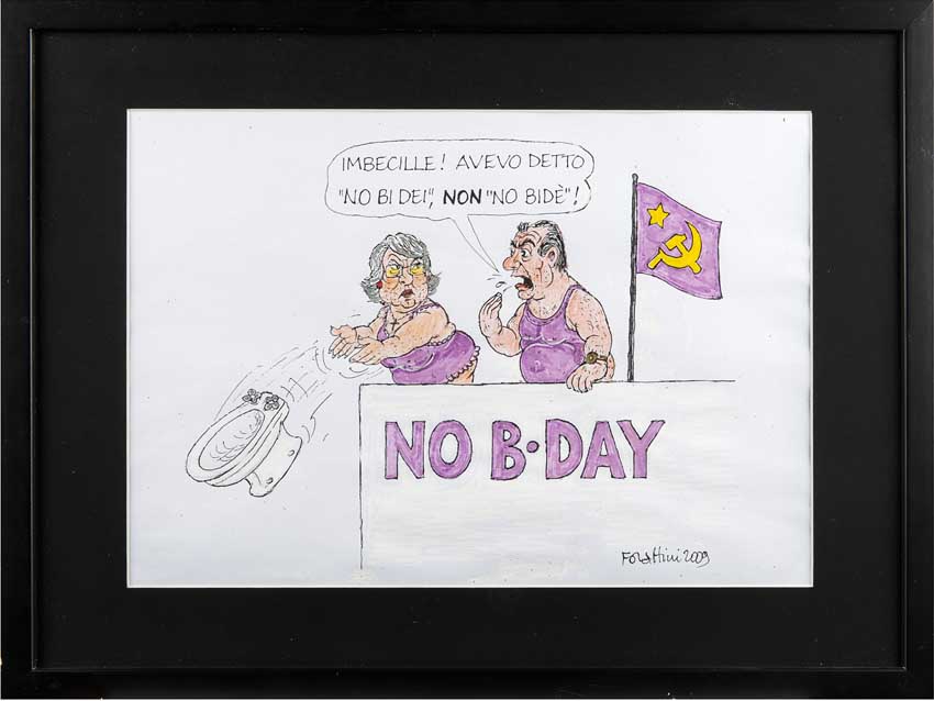 Originali "Rosy Bindi, Antonio Di Pietro e il B-Day" 2009 litografia con intervento a mano dell'artista a colori (cm 30x20)