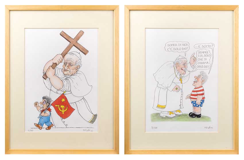 "Opus Dei; Giovanni Paolo II e il PCI" due litografie con intervento a mano a colori, edizioni di cento esemplari 2/100 e 3/100. In cornice