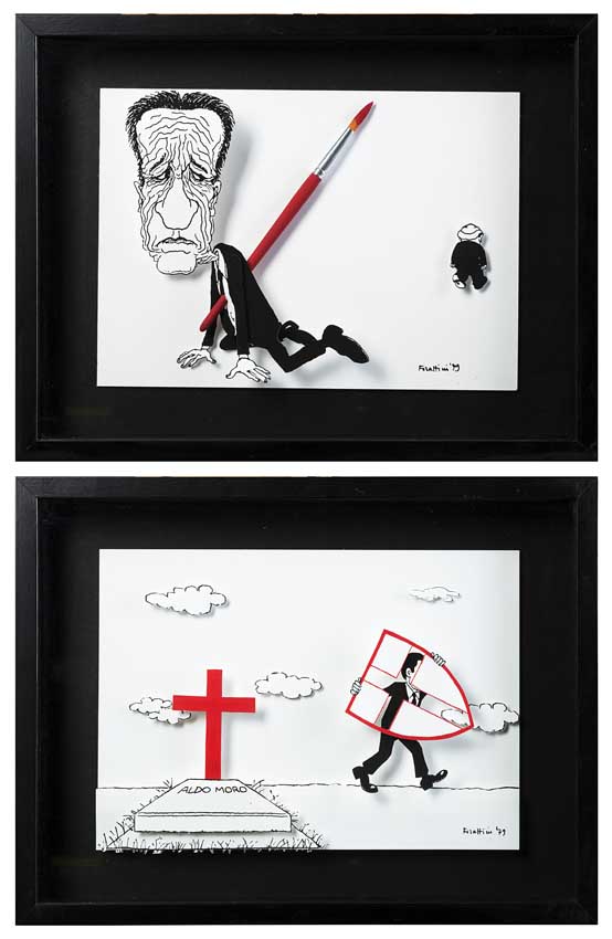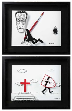 "Zaccagnini e Fanfani" 1979; "La DC dice addio alla linea Moro" 1979, disegno 3D a colori su cartoncino. In cornice (cm 20x30)