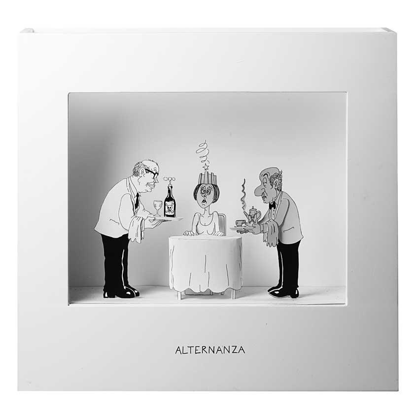 "Alternanza di governo" teatrino in carta contenuto in teca di legno e vetro,...
