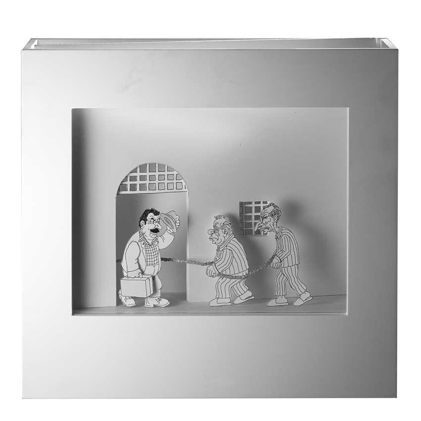 "In memoria di Giovannino Guareschi" teatrino in carta contenuto in teca di legno e vetro, 1993 (cm 45x42x12)