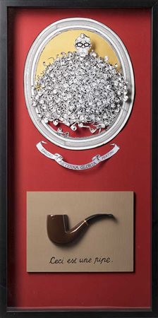 Reliquiario "Sandro Pertini" cartoncino in 3D a colori con pipa in legno contenuto in teca (cm 70x35)