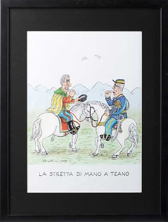 Originali "L'incontro di Teano: Umberto Bossi, Giorgio Napolitano" 2009 litografia con intervento a mano dell'artista a colori (cm 30x20)