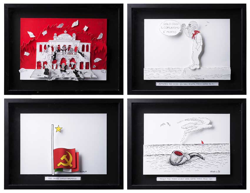 "Il PC e i Rubli di Mosca, Post Mortem di Giorgio Amendola, Luciano Lama e Giancarlo Pajetta" gruppo di quattro cartoncini in 3D a colori contenuti in teca (cm 20x30)