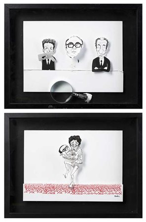 "La lente d'ingrandimento" 1977 ; "Difficoltà per il governo della non - sfiducia Andreotti - Berlinguer" 1976; due disegni 3D in bianco e nero e a colori su cartoncino (cm 20x30)