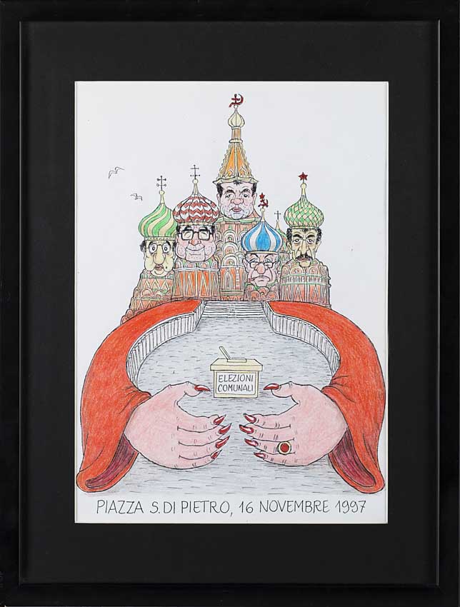 Originali "Piazza San Di Pietro" personaggi vari 1997, litografia con intervento a mano dell'artista a colori. In cornice (cm 30x20)