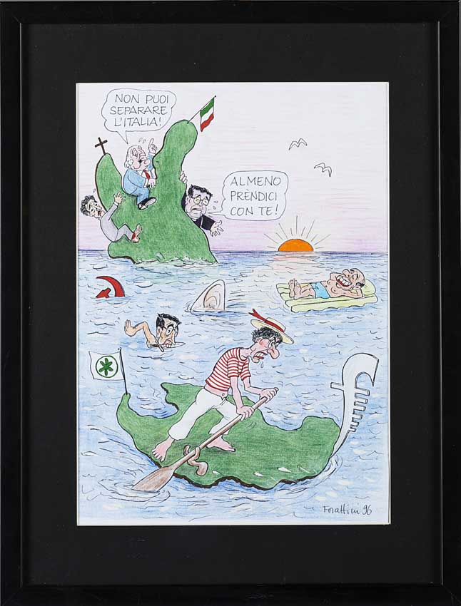 Originali "L'Italia a pezzi" 1996 litografia con intervento a mano dell'artista a colori. In cornice (cm 30x20)