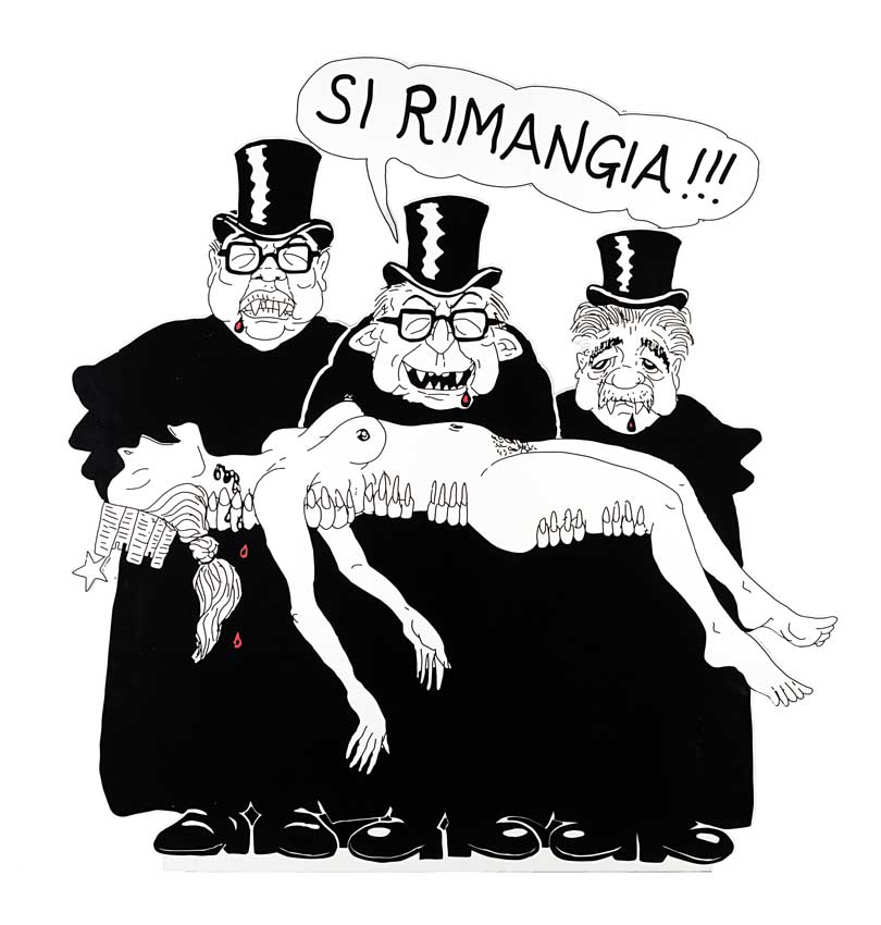 "Bettino Craxi, Giulio Andreotti e Achille Occhetto vampiri: si rimangia" sagoma in bianco e nero