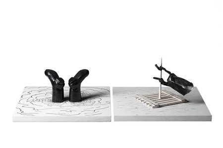 "Bettino Craxi: la fine e l'esilio" coppia di sculture in legno e carta