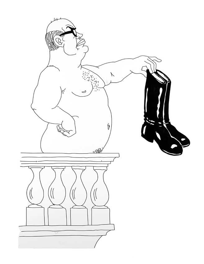"Bettino Craxi nudo al balcone con stivali Mussolini" sagoma in bianco e nero...