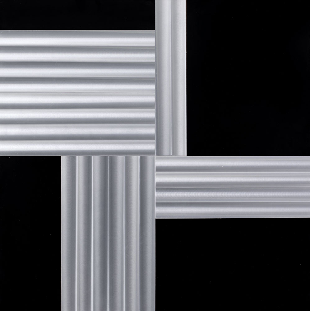 GETULIO ALVIANI Udine 05/09/1939 Superficie a testura vibratile, 1972 alluminio laminato nero cm. 60x60, titolo, firma e anno al retro, dichiarazione d'autenticità dell'artista su foto, entro teca in plexiglass.