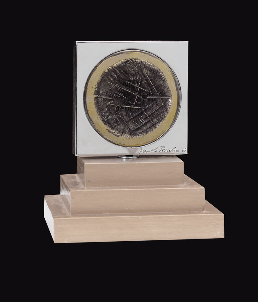 ARNALDO POMODORO Morciano di Romagna 1926 Senza titolo, 1969 scultura in bronzo dorato e argentato cm. 10x10x2,3; esemplare 240/250, firma e anno incisi in basso a destra, montata su base in legno gradinata per un totale di cm. 17 di altezza.
