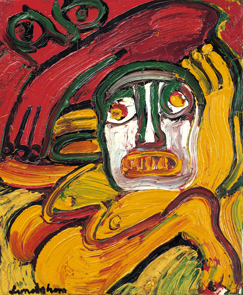 BENGT LINDSTROM Stoccolma 1925 - Njurunda 30/01/2008  Personnages, 1977 olio su tela cm. 65x54, firma in basso a sinistra, etichetta della Galleria S. Erasmo (MI) e timbri della Galleria Rinaldo Rotta (GE) al retro, opera registrata presso l'Association des Amis de l'Oeuvre de Bengt Lindstrom come da dichiarazione su foto.