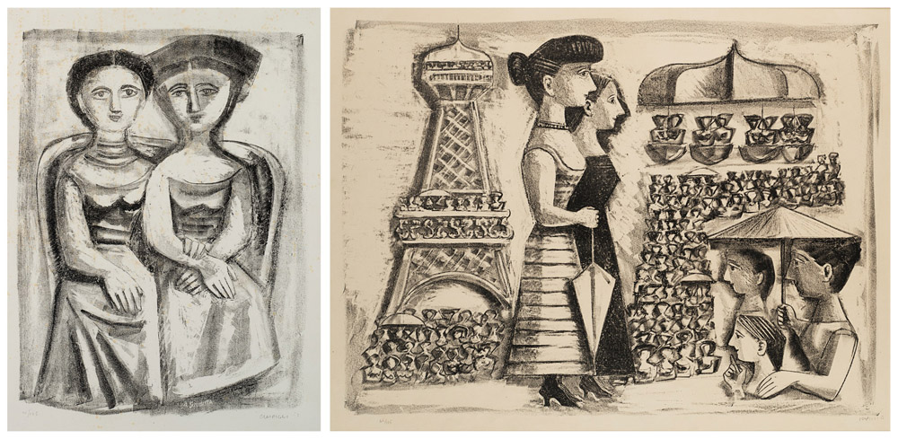 Massimo Campigli (Berlino 1895 - St. Tropez 1971) - Lotto di due litografie "Donne alla Tour Eiffel" e "Due donne". Entrambe firmate e numerate es. 41/125 (cm 55x70 cad.) (2)