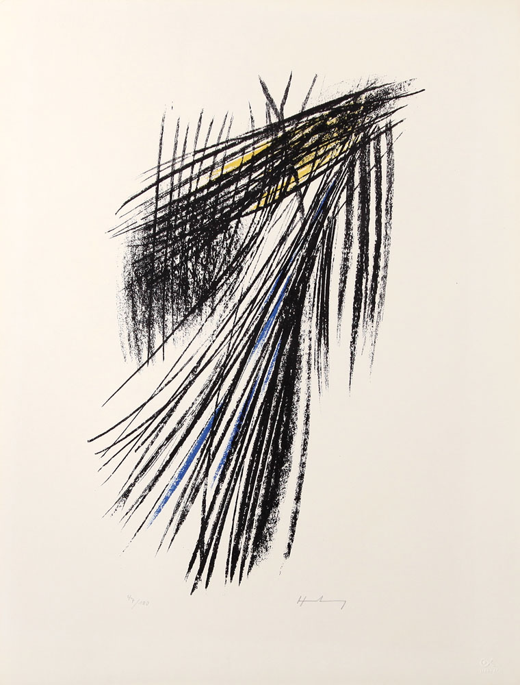 HANS HARTUNG Lipsia 1904 - Antibes 1989 L23, 1957 litografia su carta BFK Rives cm. 65,5x50, esemplare 47/100, firma in basso a destra, timbro a secco della Edizioni Marbach (Berna) in basso a destra, pubblicata sul catalogo delle Edizioni Schmucking alla pagina 86.