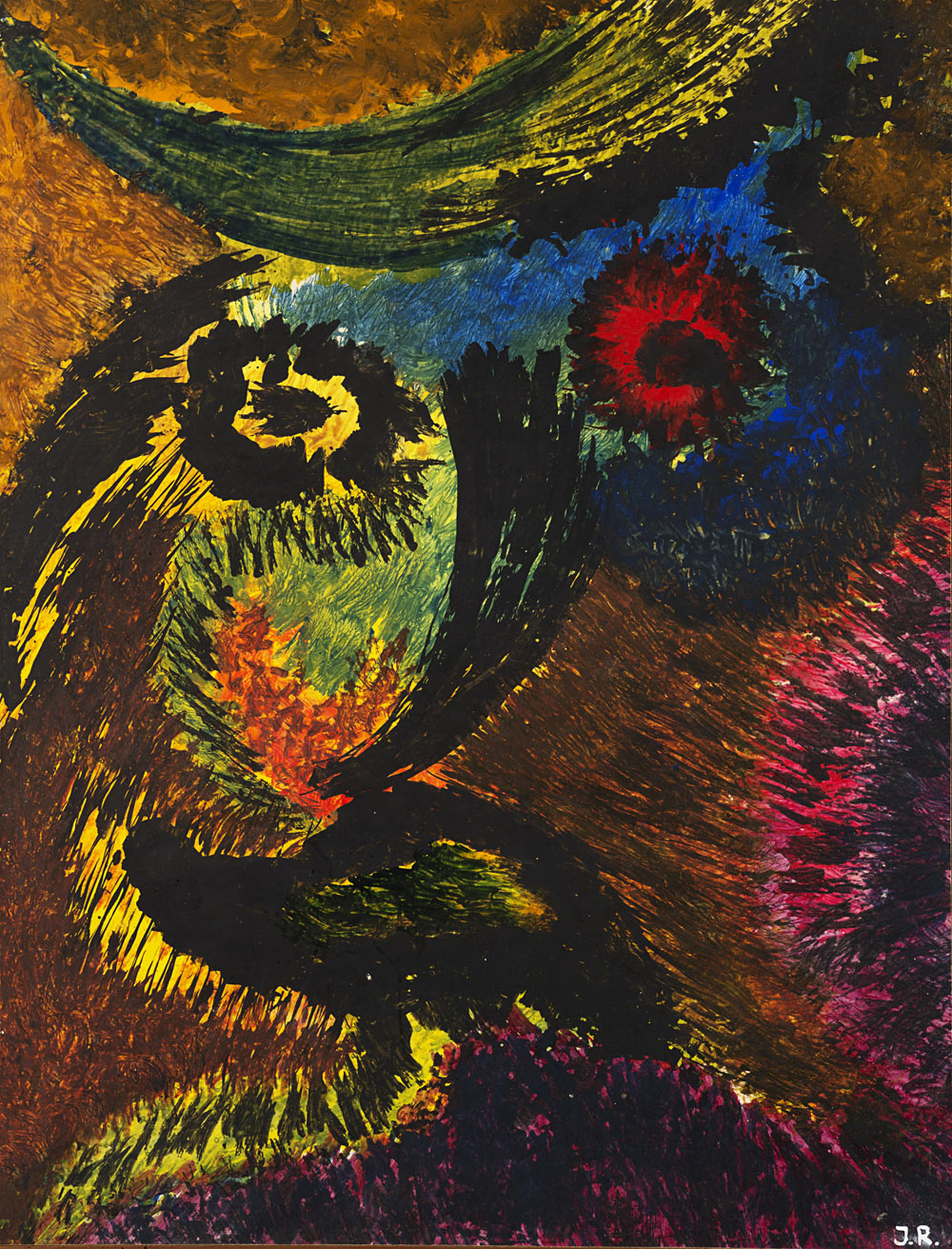 Jean Raine (Bruxelles 1927 - Rochetaillée-sur-Saône 1986) - "Coiffé de lune" 1967 olio su tavola, cm 62x47 Siglato in basso a destra. Firmato titolato e datato al retro