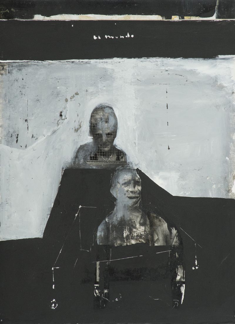 Marco Fantini, Vicenza 1965 - , Il mondo 2001, Olio sabbia e gesso su carta intelata, cm. 40,2x30, Sul verso: sigla, data e titolo., Esposizione: "Fantini - Genesi di un quadro", Alberto Fiz. Galleria Poggiali e Forconi, Firenze, Galleria Il Castello Trento, 2001, pubblicato tav. 5 e pag. 32.,