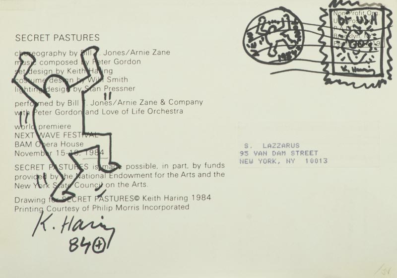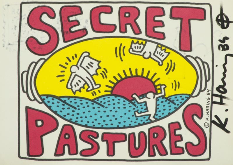 Keith Haring, Pennsylvania 1958 - New York 1990, Secret Pastures 1984, Cartoncino invito, cm. 15,4x21,7, Firma e data sul lato destro; Sul verso altro intervento., ,