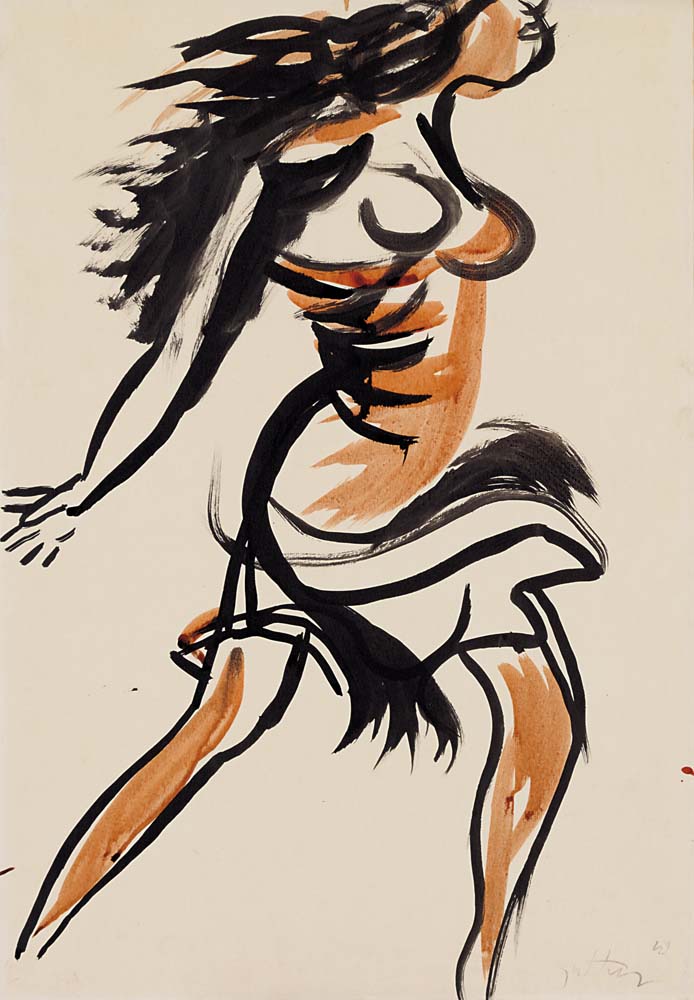 RENATO GUTTUSO Bagheria (Pa) 02/01/1912 - Roma 17/01/1987 Ragazza che fugge, 1949 acquerello su carta cm. 48x32, firma e anno in basso a destra, dichiarazione d'autenticità dell'artista e timbro con firma per autenticità e provenienza della Galleria d'Arte Nanni (BO) su foto, opera registrata presso l'Archivio Renato Guttuso (Fabio Carapezza Guttuso) come da dichiarazione su foto.
