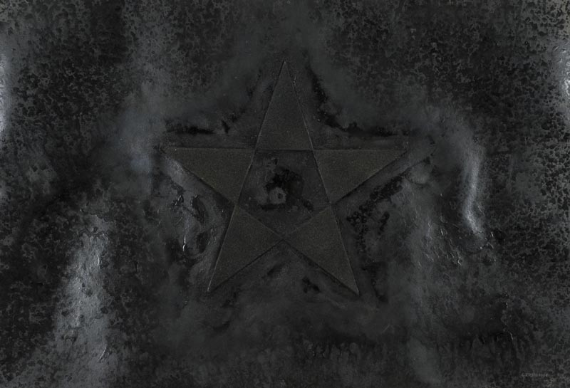 Gilberto Zorio, Andorno Micca, Biella 1944 - , Stella nera su nero 2005, Tecnica mista e sabbia di Stromboli su carton cuoio, cm. 80x117, Firma in basso a destra; Sul verso: firma, data e titolo., , Autentica dell'Artista su foto.