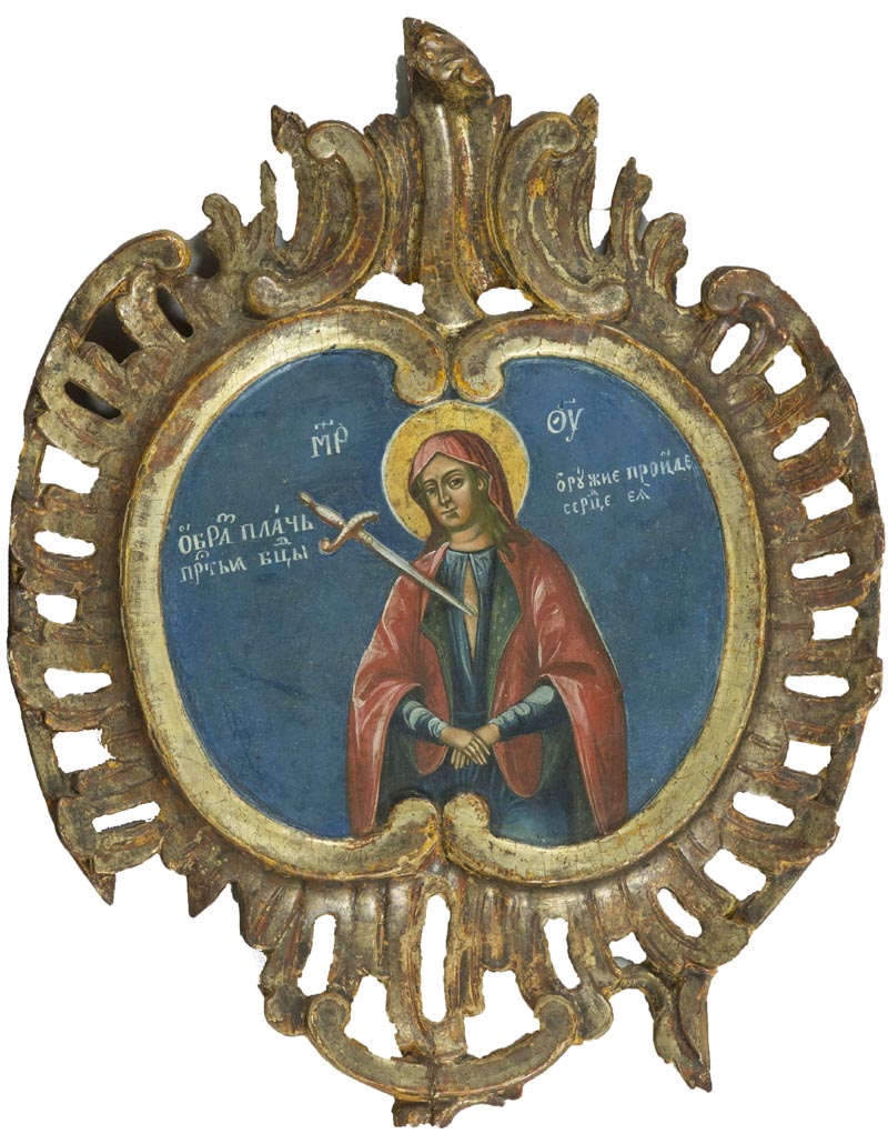 Icona Russa metà '700, - , Madre di Dio - Profezia di San Simeone , Tavola, gesso, argento meccato, tempera all'uovo, cornice in legno intagliato a forma di cartouche rococò cm. 49x8. Il soggetto rappresenta la profezia di San Simeone, che pronuncia le seguenti parole alla Maria "e anche a te una spada trafiggerà l'anima perché siano svelati pensieri di molti cuori". Vangelo di San Luca., , ,